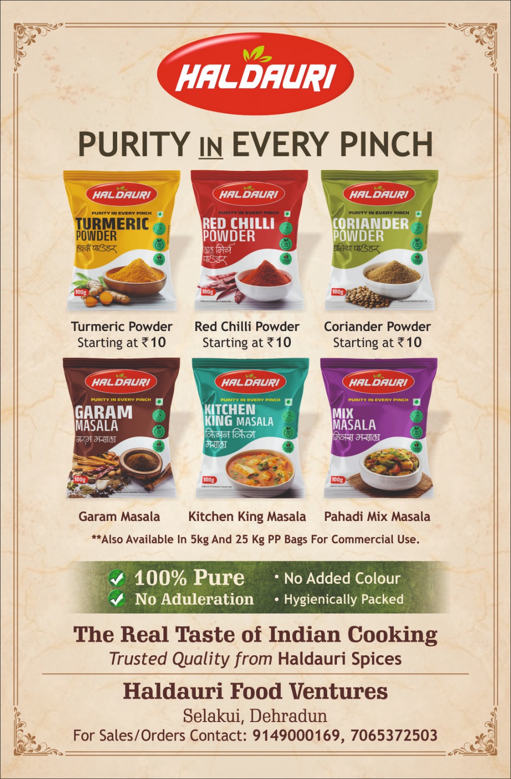 Haldauri Food Ventures is committed to delivering pure, hygienic, and authentic Indian spices. We carefully source raw materials from trusted farms to maintain natural aroma and taste.